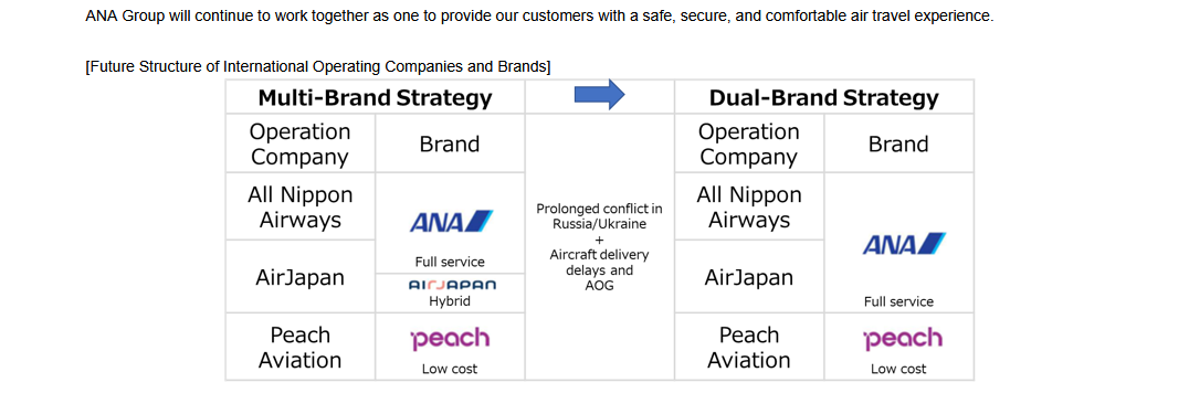 According to the ANA Group, the decision to suspend the operations of AirJapan was made as part of a restructuring of its current multi-brand strategy into a dual-brand operation. The airline group also cited the global environment – specifically citing the ongoing war between Russia and Ukraine – and aircraft delivery delays as contributing reasons that led to the decision. In its statement, ANA stated the move is aimed to “maximize the entire group's profitability and competitiveness while flexibly responding to recent changes in the business environment.”