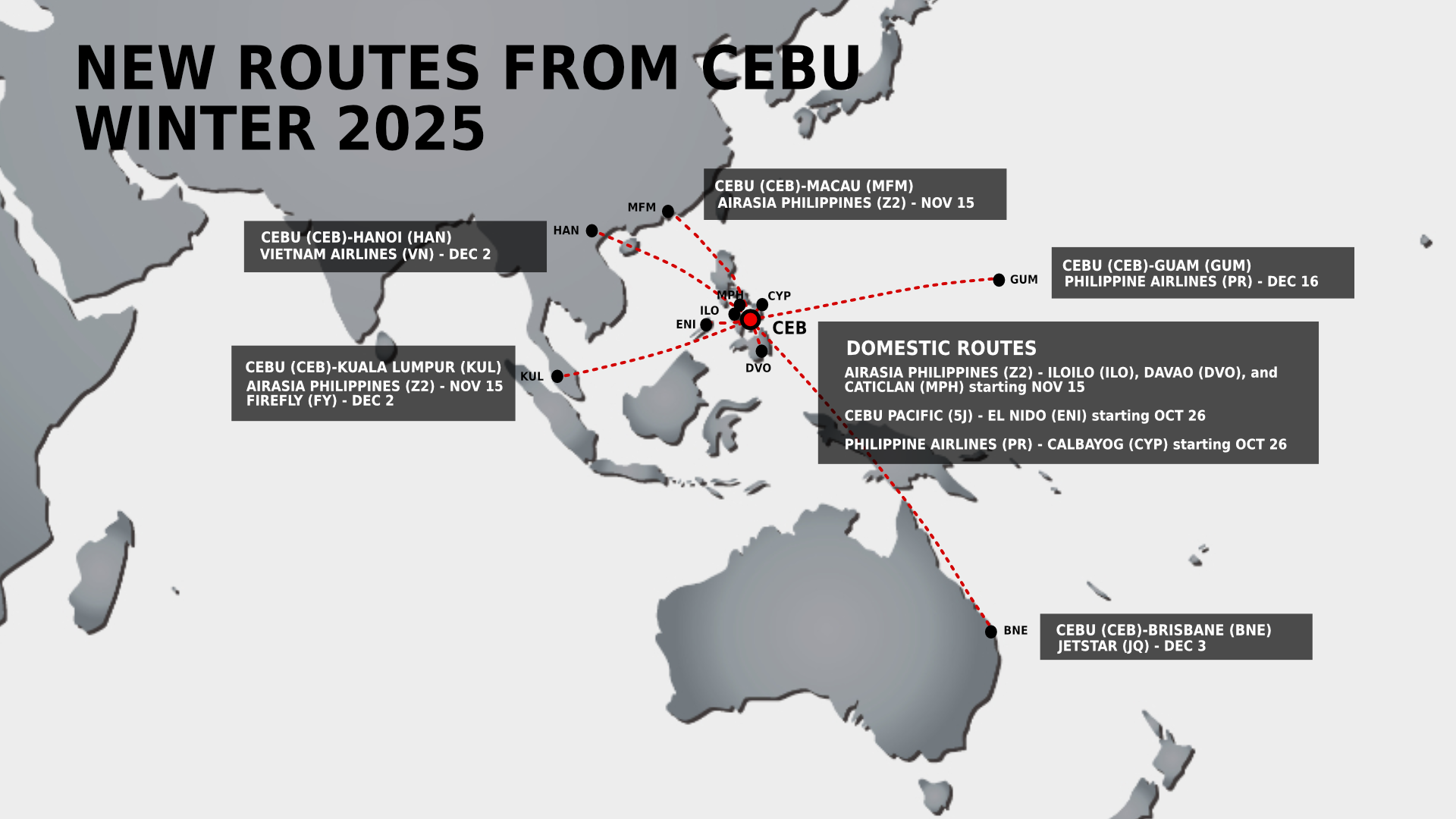 Several airlines have announced new routes to/from Cebu, which will include a historic first direct airlink from the central Philippine city to Australia, and new connections to Southeast Asia and the US.