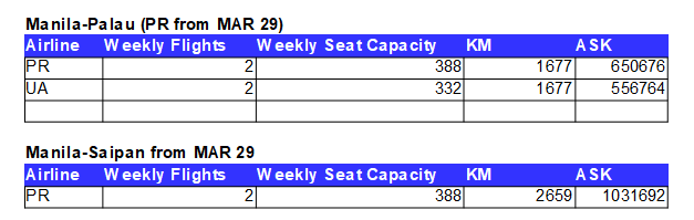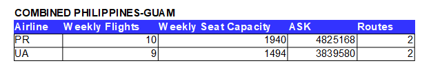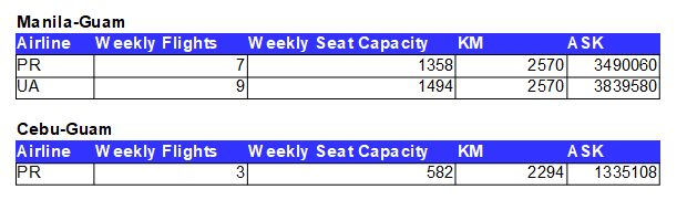 United will continue to maintain the advantage on flights between Manila and Guam with 9 including the twice-weekly flights via Palau. Philippine Airlines' 10 flights to Guam comprises of the seven weekly Manila-Guam and the thrice-weekly Cebu-Guam services. With more flights and the use of the higher capacity A321s, Philippine Airlines now has the largest weekly seat capacity between the Philippines and Guam.