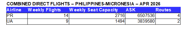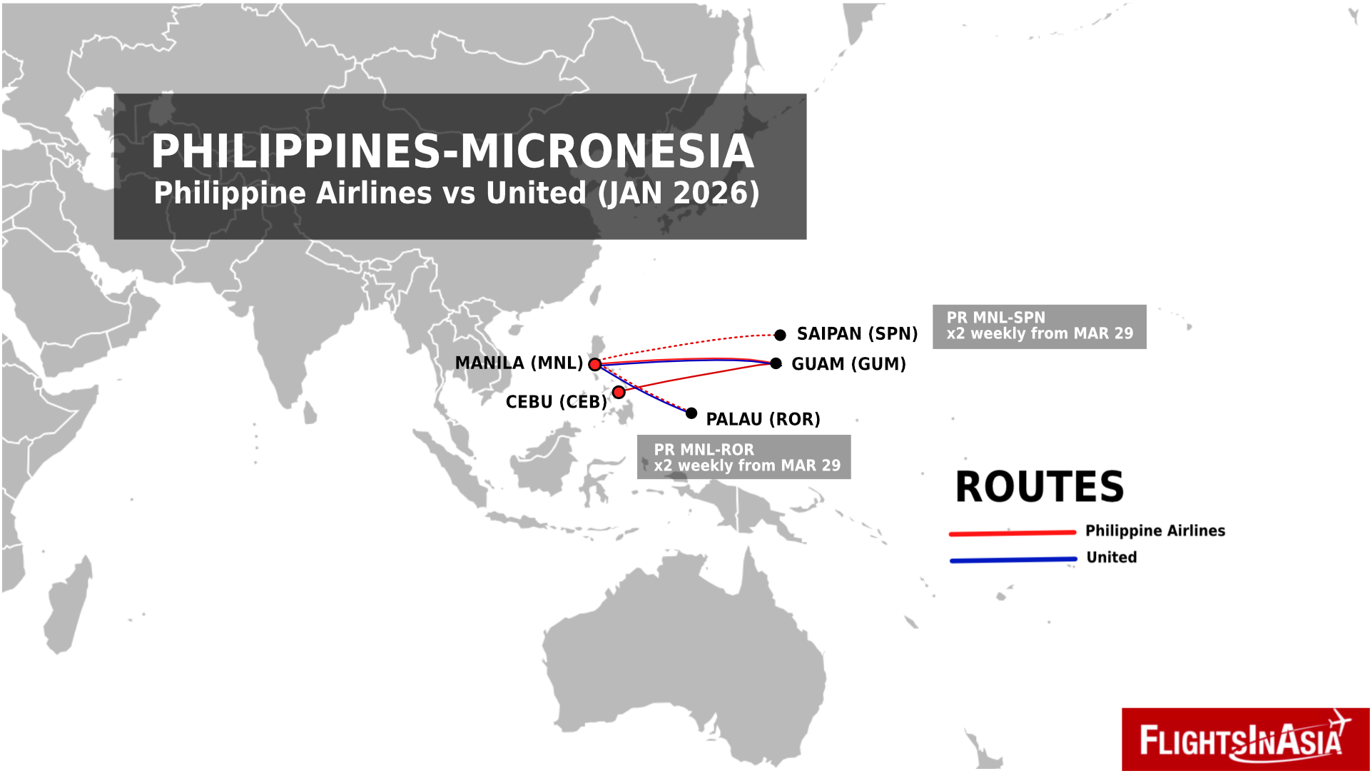 Now operating flights from both Manila and Cebu to Guam, Philippine Airlines is even with United when it comes to routes offered to Micronesia from the Philippines. However, the thrice-weekly Cebu-Guam route now give Philippine Airlines the edge in weekly flights and seat capacity between the Philippines and Guam. This advantage is expected to be further increased by April 2026 after the Manila-Palau and Manila-Saipan routes are launched on March 29.