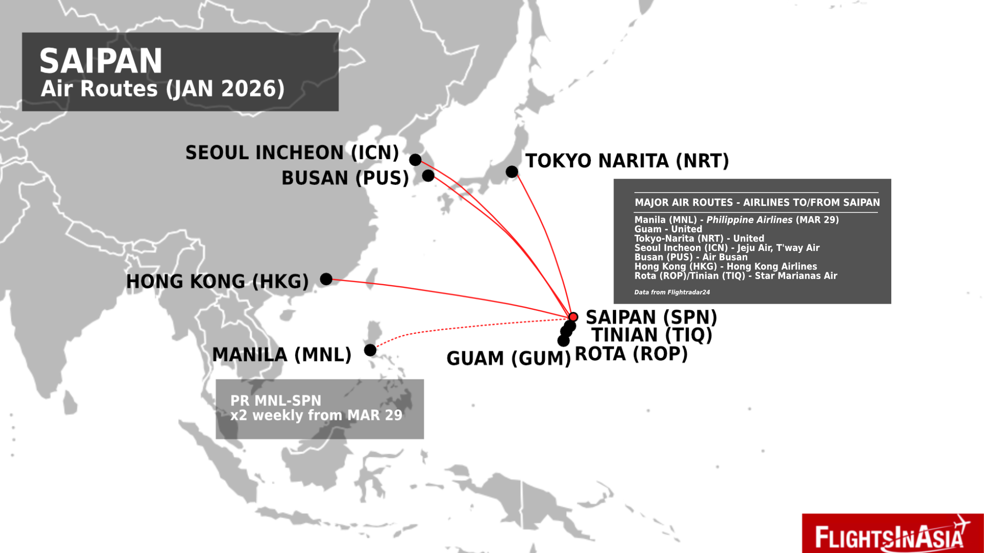 Saipan has limited direct air services. At present, the island is served by flights to Guam and Tokyo Narita by United, along with Hong Kong (Hong Kong Airlines), Seoul (T'way Air and Jeju Air), and Busan (Air Busan). The return of Philippine Airlines to the island will provide more travel options for residents and visitors alike.