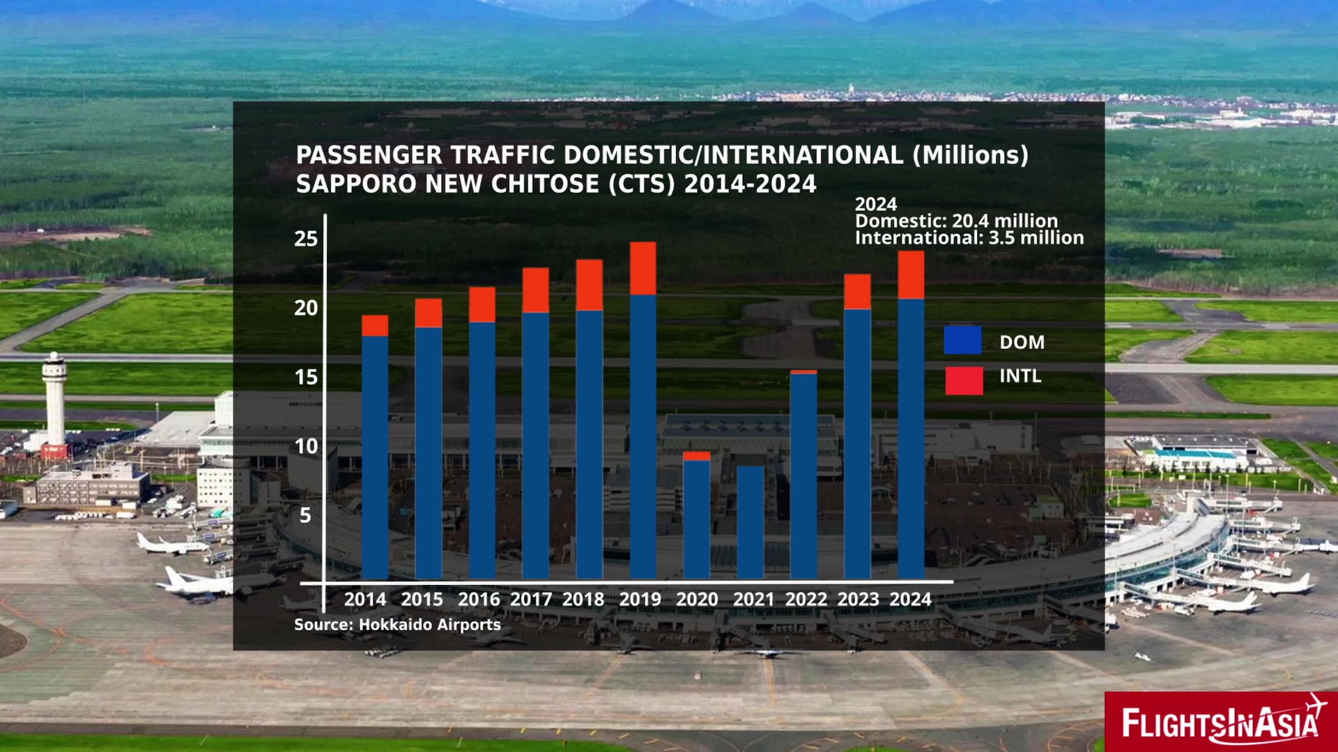 While international passenger traffic has grown at New Chitose, the 3.5 million international passengers in 2024 represents a small 14% of the overall passenger traffic at the airport. The vast majority of travelers by air to/from Sapporo – over 20 million – flew on any of the multiple daily domestic flights from other Japanese cities such as Tokyo, Osaka, Nagoya, and Fukuoka. These flights are mostly served by the big Japanese carriers All Nippon Airways (ANA), Japan Airlines (JAL), and their budget subsidiaries Jetstar Japan (JAL) and Peach Aviation (Peach).