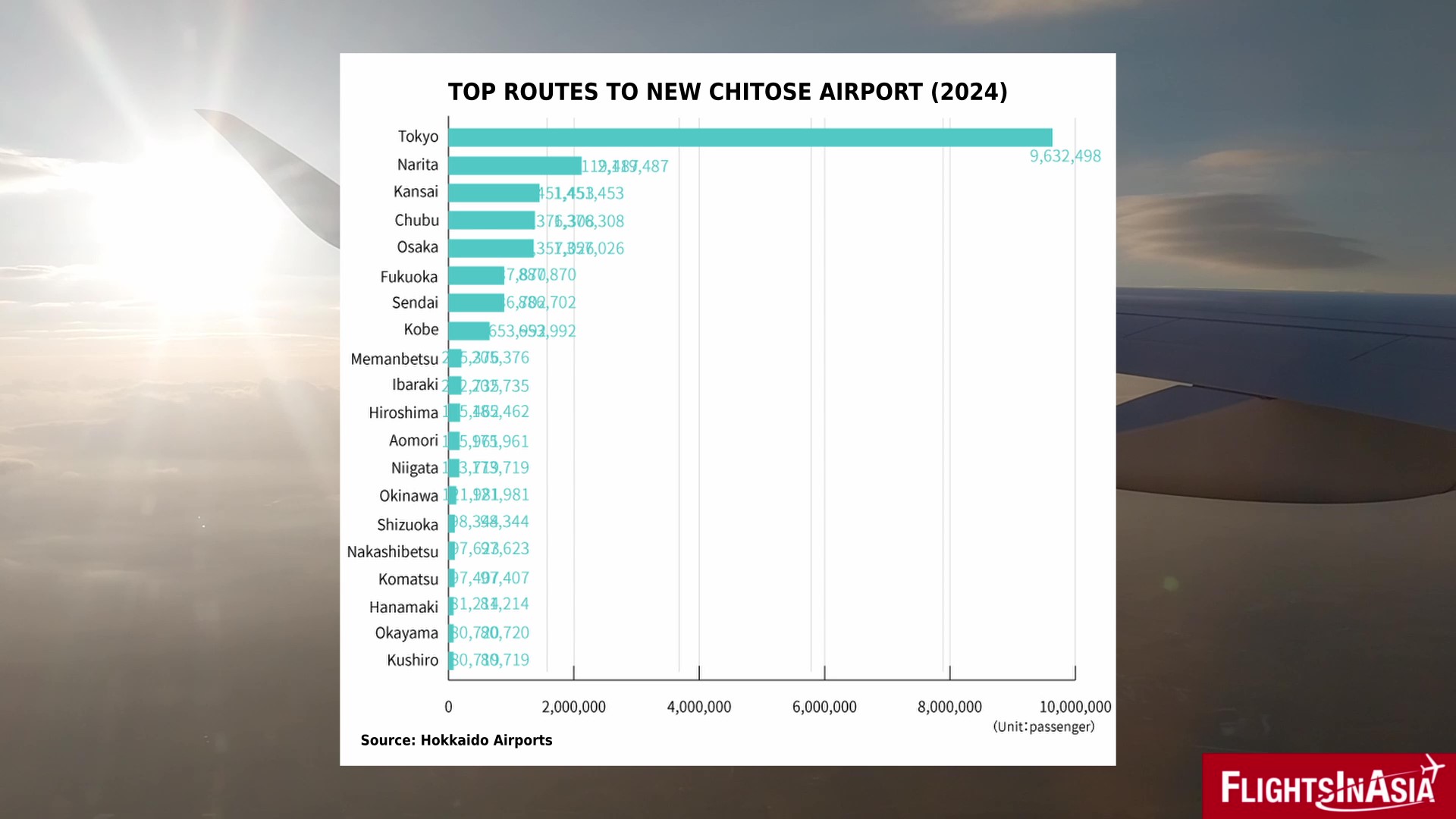 Following the Haneda-Sapporo route, the rest of the top routes to/from New Chitose are domestic routes to Tokyo-Narita, Osaka-Kansai, Nagoya-Chubu, Osaka-Itami, and Fukuoka.