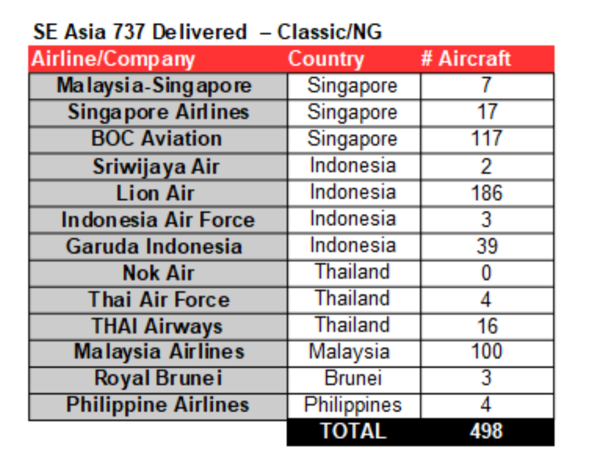 Over the course of the next few decades, Boeing would deliver around 500 737 Classic and NG (-100 to -900) aircraft to around 10 airlines and 2 military customers in Southeast Asia. Among the major airline operators in Southeast Asia included THAI Airways, Royal Brunei Airlines, Philippine Airlines, and Malaysia Airlines. Of the airlines mentioned, Malaysia Airlines would be a major customer of the 737 taking in a total of 100 737s between 1972 and 2014.