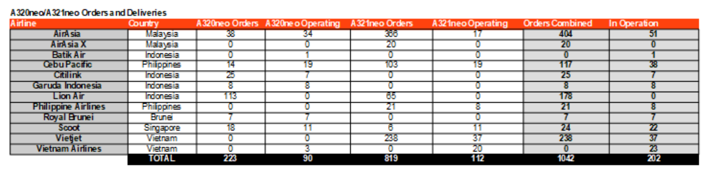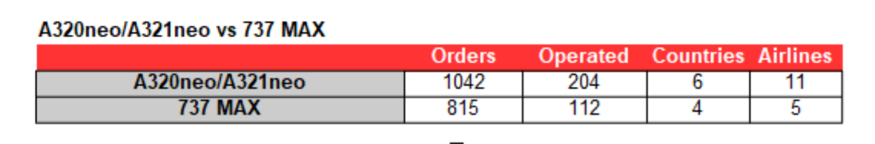 Based on records from Airbus and Boeing, Airbus leads with orders for its A320neo/A321neos with 1042 orders versus the 737 MAX with 815. 204 A320neo/A321neo aircraft are currently in operation in the region versus 112 MAX.