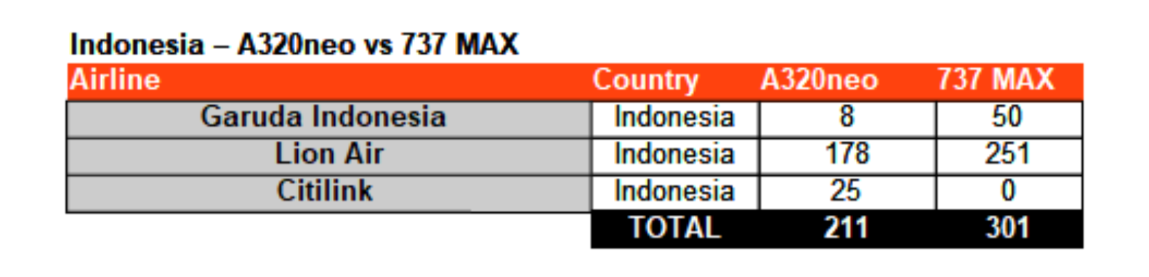 Airbus and its A320neo currently leads in orders and aircraft in operation in Southeast Asia, though the region has three countries that can be considered contested for narrowbody aircraft orders: Indonesia, Vietnam, and Singapore. The biggest of these countries is Indonesia, where airlines such as Garuda Indonesia and Lion Air have a long history of operating 737 aircraft. While Airbus has secured over 200 orders for A320neo aircraft from airlines including major 737 operator Lion Air, Boeing leads with its 300 orders for the MAX in the country.